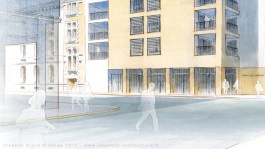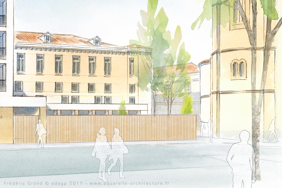 Perspectives à l'aquarelle de l'ensemble des bâtiments réhabilités et construits